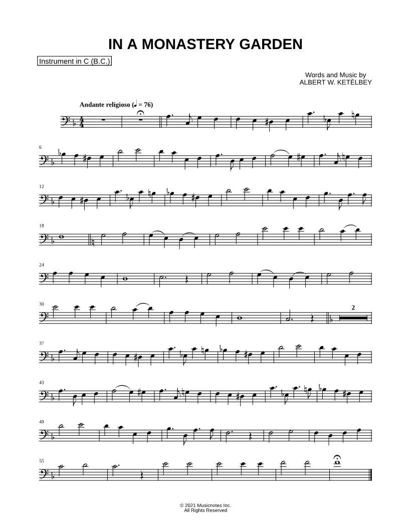 1. In a Monastery Garden - Bass Clef Instrument (click here to preview and play this piece) Composer: Lyricist: Scored For:Instrumental Solo and Instrumental Part Instruments:Bass Clef Instrument, Double Bass, Cello, Baritone Horn, Trombone and Bassoon Number of pages:1 Click here to purchase this piece separately for $4.99 |