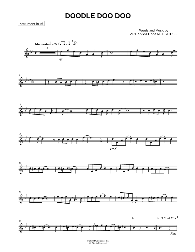 1. Doodle Doo Doo - Bb Instrument (click here to preview and play this piece) Performers: Composers: Lyricists: Scored For:Instrumental Solo and Instrumental Part Instruments:Bb Instrument, range: F4-F5, Tenor Saxophone, Soprano Saxophone, Clarinet and Trumpet Number of pages:1 Click here to purchase this piece separately for $0.00 |