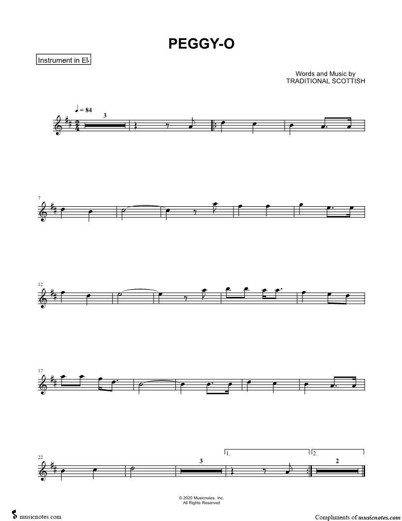 1. Peggy-O - Eb Instrument (click here to preview and play this piece) Composer: Lyricist: Scored For:Instrumental Solo and Instrumental Part Instruments:Eb Instrument, range: A4-B5, Alto Saxophone and Baritone Saxophone Number of pages:1 Click here to purchase this piece separately for $4.99 |