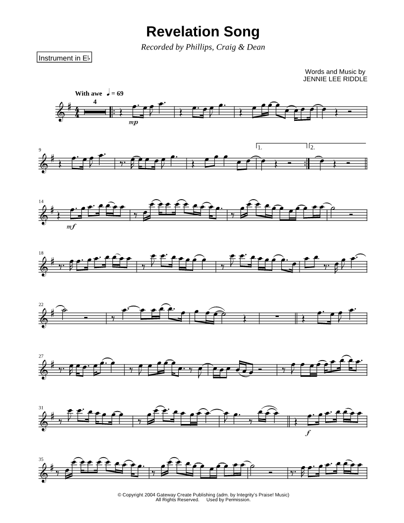 1. Revelation Song - Eb Instrument (click here to preview and play this piece) Performer: Composer: Lyricist: Scored For:Instrumental Solo and Instrumental Part Instruments:Eb Instrument, range: G4-F#6, Alto Saxophone and Baritone Saxophone Number of pages:2 Click here to purchase this piece separately for $4.99 |