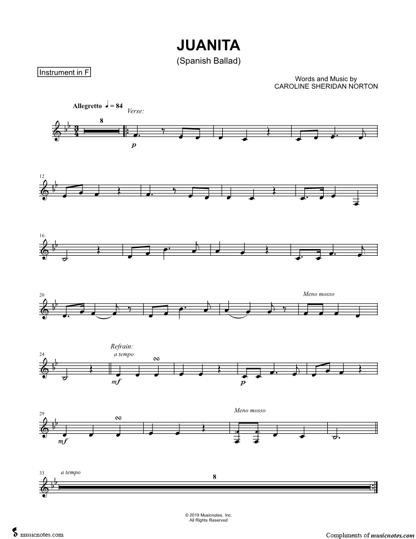 1. Juanita - F Instrument (click here to preview and play this piece) Composer: Lyricist: Scored For:Instrumental Solo and Instrumental Part Instruments:F Instrument, range: F3-Bb4 and French Horn Number of pages:1 Click here to purchase this piece separately for $4.99 |