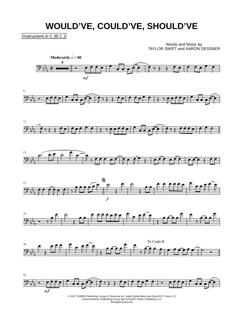 1. Would've, Could've, Should've - Bass Clef Instrument (click here to preview and play this piece) Performer: Composers: Lyricists: Scored For:Instrumental Solo and Instrumental Part Instruments:Bass Clef Instrument, Double Bass, Cello, Baritone Horn, Trombone and Bassoon Number of pages:3 Click here to purchase this piece separately for $4.99 |