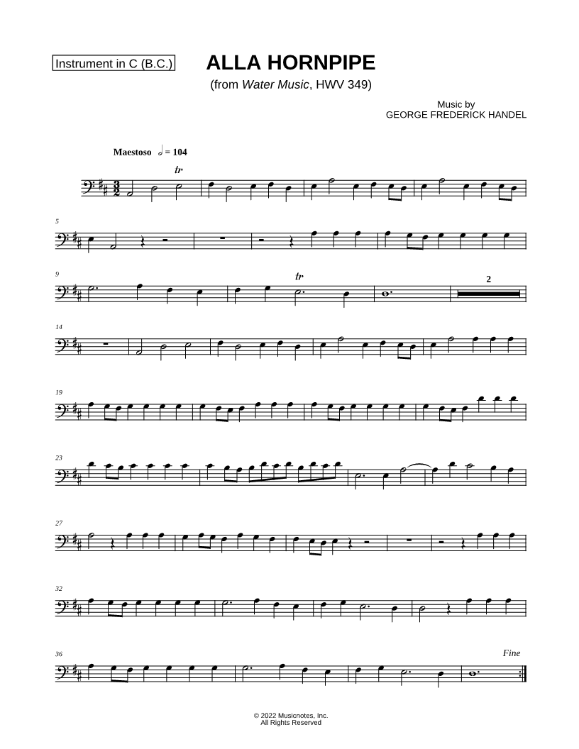 1. Alla Hornpipe from Water Music - Bass Clef Instrument (click here to preview and play this piece) Composer: Scored For:Instrumental Solo and Instrumental Part Instruments:Bass Clef Instrument, Double Bass, Cello, Baritone Horn, Trombone and Bassoon Number of pages:2 Click here to purchase this piece separately for $4.99 |