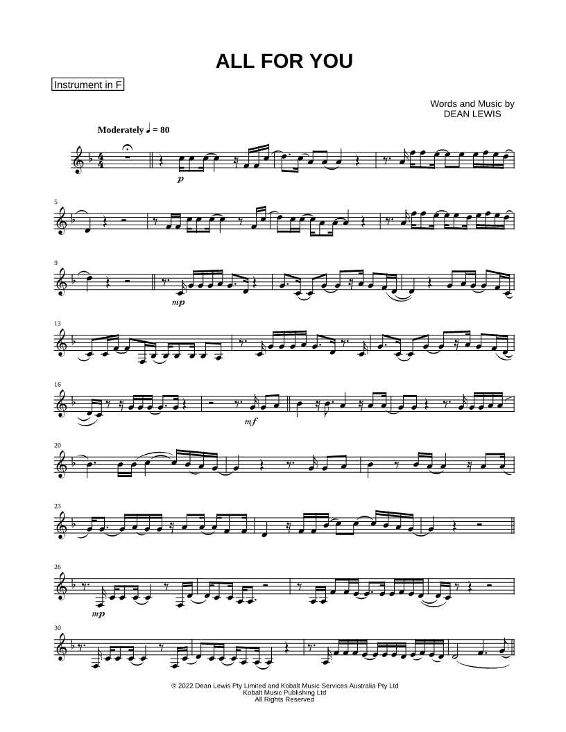 1. All for You - F Instrument (click here to preview and play this piece) Performer: Composer: Lyricist: Scored For:Instrumental Solo and Instrumental Part Instruments:F Instrument, range: F3-F5 and French Horn Number of pages:2 Click here to purchase this piece separately for $4.99 |