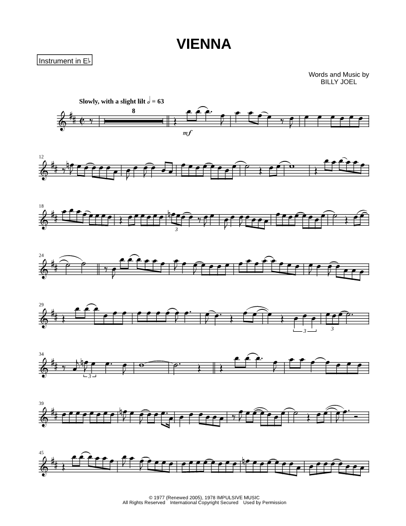 1. Vienna - Eb Instrument (click here to preview and play this piece) Performer: Composer: Lyricist: Scored For:Instrumental Solo and Instrumental Part Instruments:Eb Instrument, range: G4-B5, Baritone Saxophone and Alto Saxophone Number of pages:2 Click here to purchase this piece separately for $4.99 |