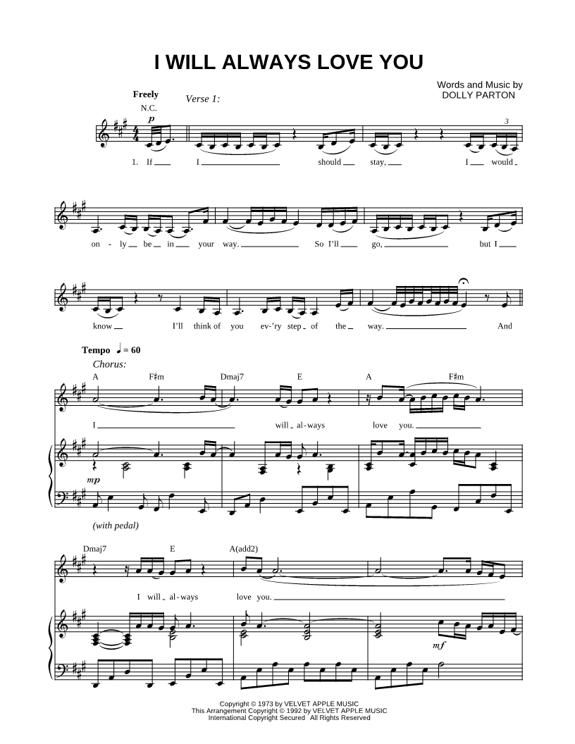 1. I Will Always Love You (click here to preview and play this piece) Performers: Composer: Lyricist: Scored For:Piano/Vocal/Chords Instruments:Piano, range: C#1-D#6 and Voice, range: F#3-G#5 Number of pages:5 Click here to purchase this piece separately for $5.99 |