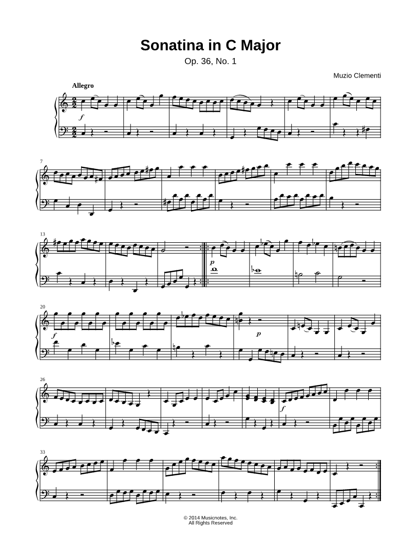 1. Sonatina in C Major, Op. 36, No. 1 (click here to preview and play this piece) Composer: Scored For:Instrumental Solo Instrument:Piano Number of pages:3 Click here to purchase this piece separately for $5.99 |
