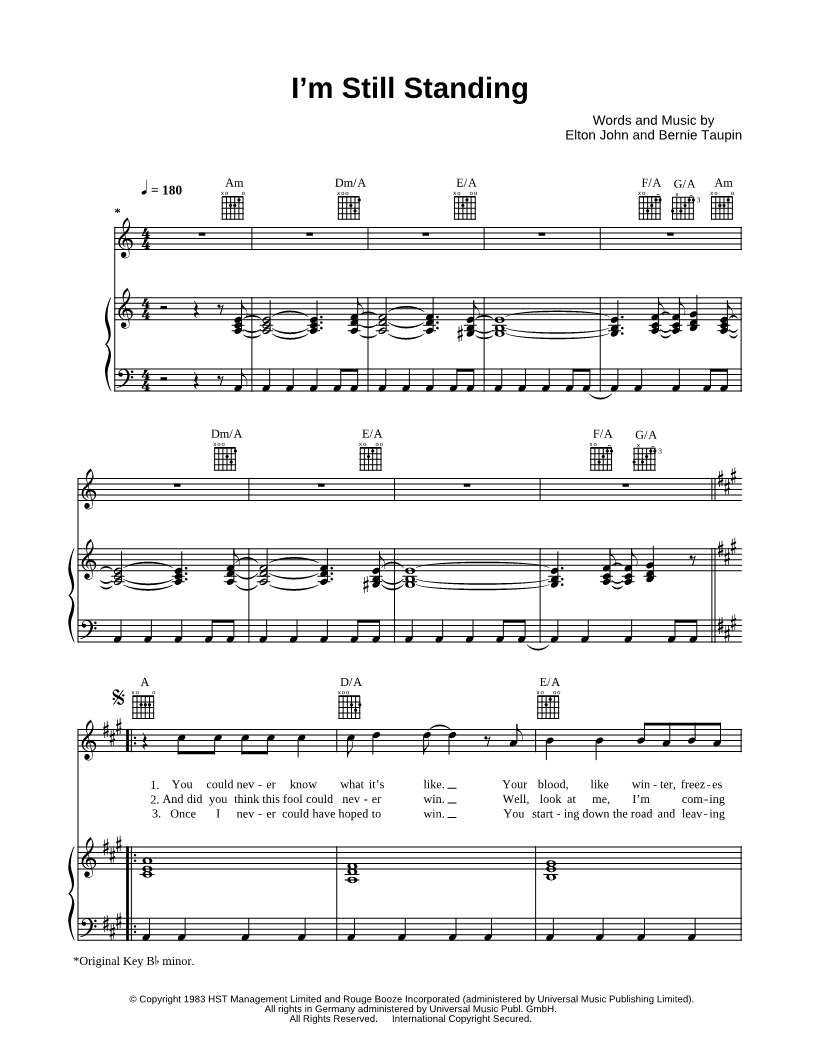 1. I'm Still Standing (click here to preview and play this piece) Performers: Composers: Lyricists: Scored For:Piano/Vocal/Guitar and Singer Pro Instruments:Voice, range: A3-C#6, Piano and Guitar Number of pages:5 Click here to purchase this piece separately for $5.99 |