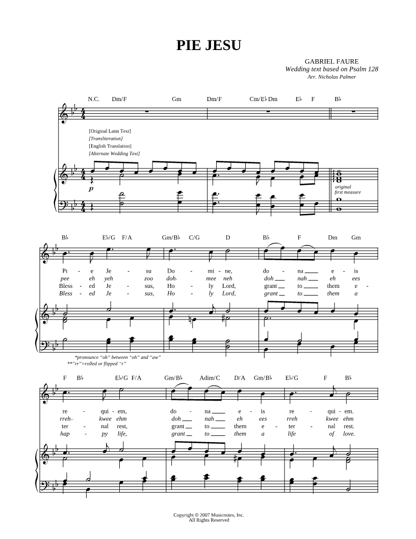 1. Pie Jesu (click here to preview and play this piece) Composer: Lyricists: Latin Hymn and Psalm 128 Scored For:Piano/Vocal/Chords Instruments:Voice, range: Eb4-F5 and Piano Number of pages:4 Click here to purchase this piece separately for $5.99 |