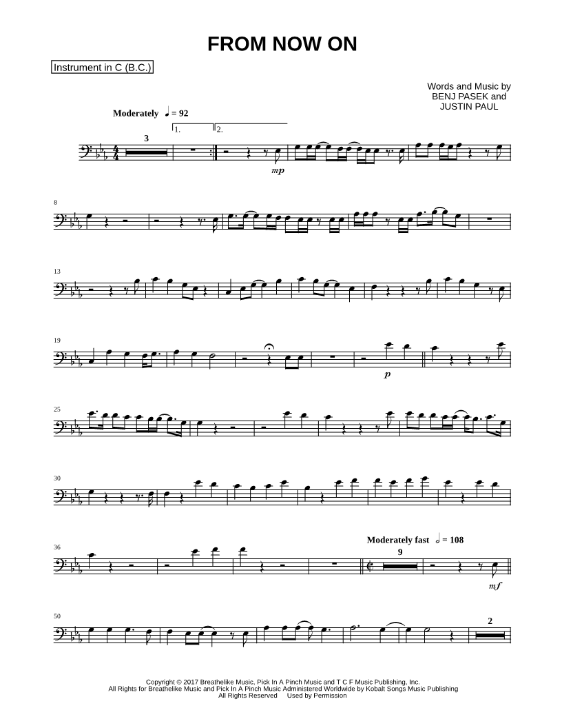 1. From Now On - Bass Clef Instrument (click here to preview and play this piece) Composers: Lyricists: Scored For:Instrumental Solo and Instrumental Part Instruments:Bass Clef Instrument, Baritone Horn, Bassoon, Cello, Double Bass and Trombone Number of pages:4 Click here to purchase this piece separately for $4.99 |