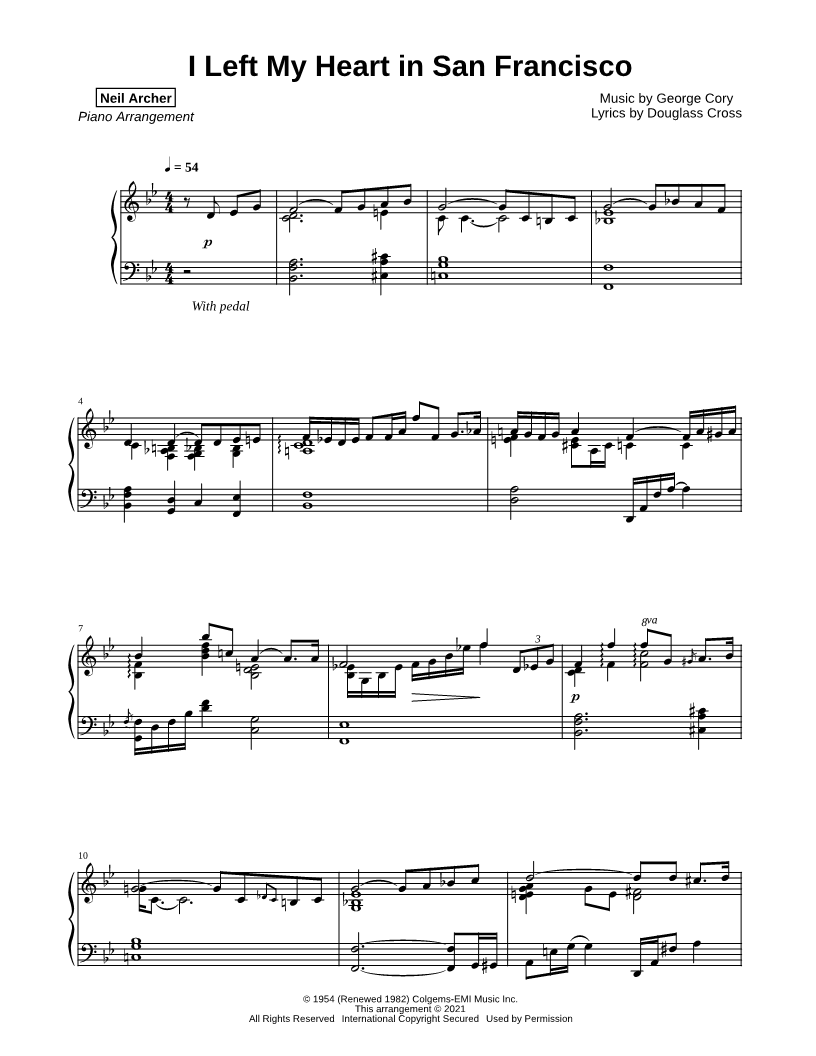 1. I Left My Heart in San Francisco (click here to preview and play this piece) Performers: Composer: Lyricist: Scored For:Instrumental Solo Instrument:Piano Number of pages:6 Click here to purchase this piece separately for $9.99 |
