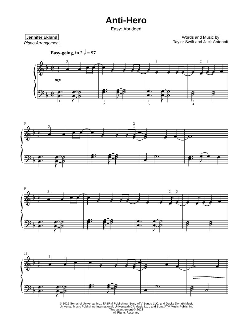 1. Anti-Hero [easy - abridged] (click here to preview and play this piece) Performers: Composers: Lyricists: Scored For:Instrumental Solo Instrument:Piano Number of pages:3 Click here to purchase this piece separately for $3.99 |