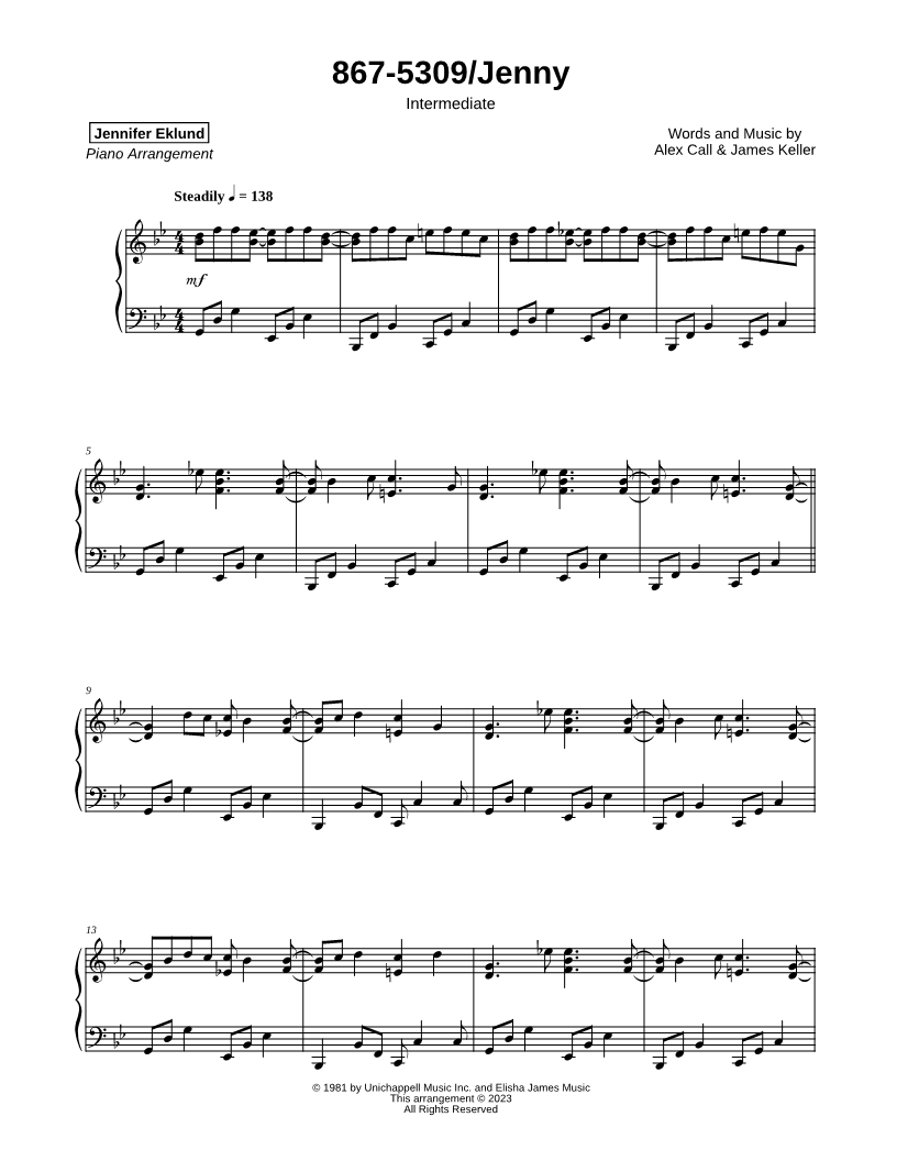 1. 867-5309 / Jenny [intermediate] (click here to preview and play this piece) Performers: Composers: Lyricists: Scored For:Instrumental Solo Instrument:Piano Number of pages:7 Click here to purchase this piece separately for $5.79 |