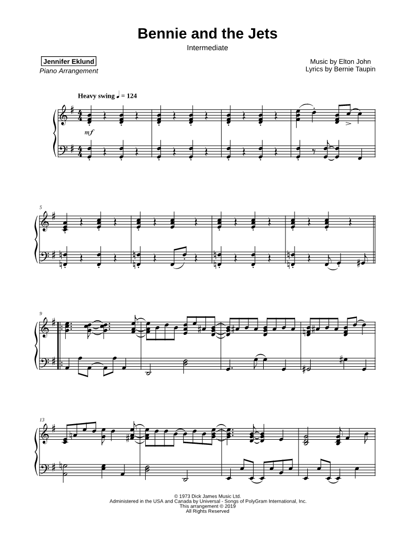 1. Bennie and the Jets [intermediate] (click here to preview and play this piece) Performers: Composer: Lyricist: Scored For:Instrumental Solo Instrument:Piano Number of pages:5 Click here to purchase this piece separately for $5.79 |
