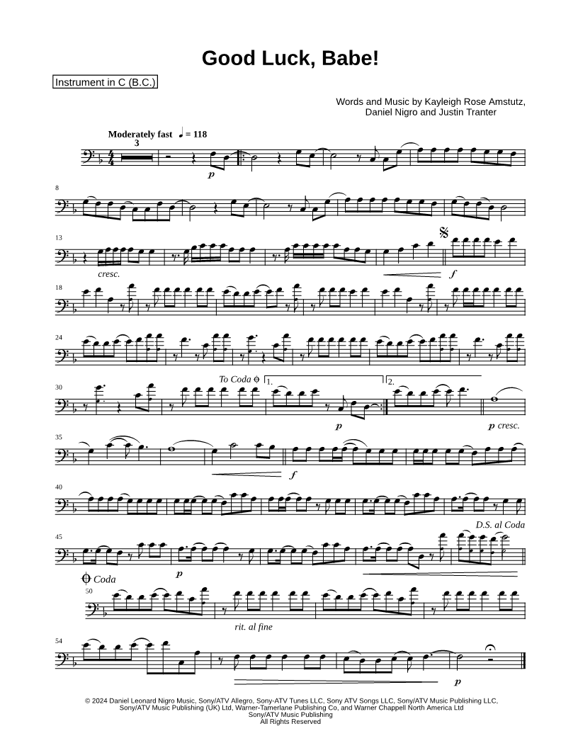 1. Good Luck, Babe! - Bass Clef Instrument (click here to preview and play this piece) Performer: Composers: Lyricists: Scored For:Instrumental Solo and Instrumental Part Instruments:Bass Clef Instrument 1, range: C3-A4, Baritone Horn, Bassoon, Cello, Double Bass and Trombone Number of pages:1 Click here to purchase this piece separately for $4.99 |