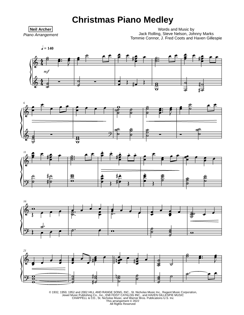 1. Christmas Piano Medley (click here to preview and play this piece) Performer: Composers: Lyricists: Scored For:Instrumental Solo Instrument:Piano Number of pages:7 Click here to purchase this piece separately for $9.99 |