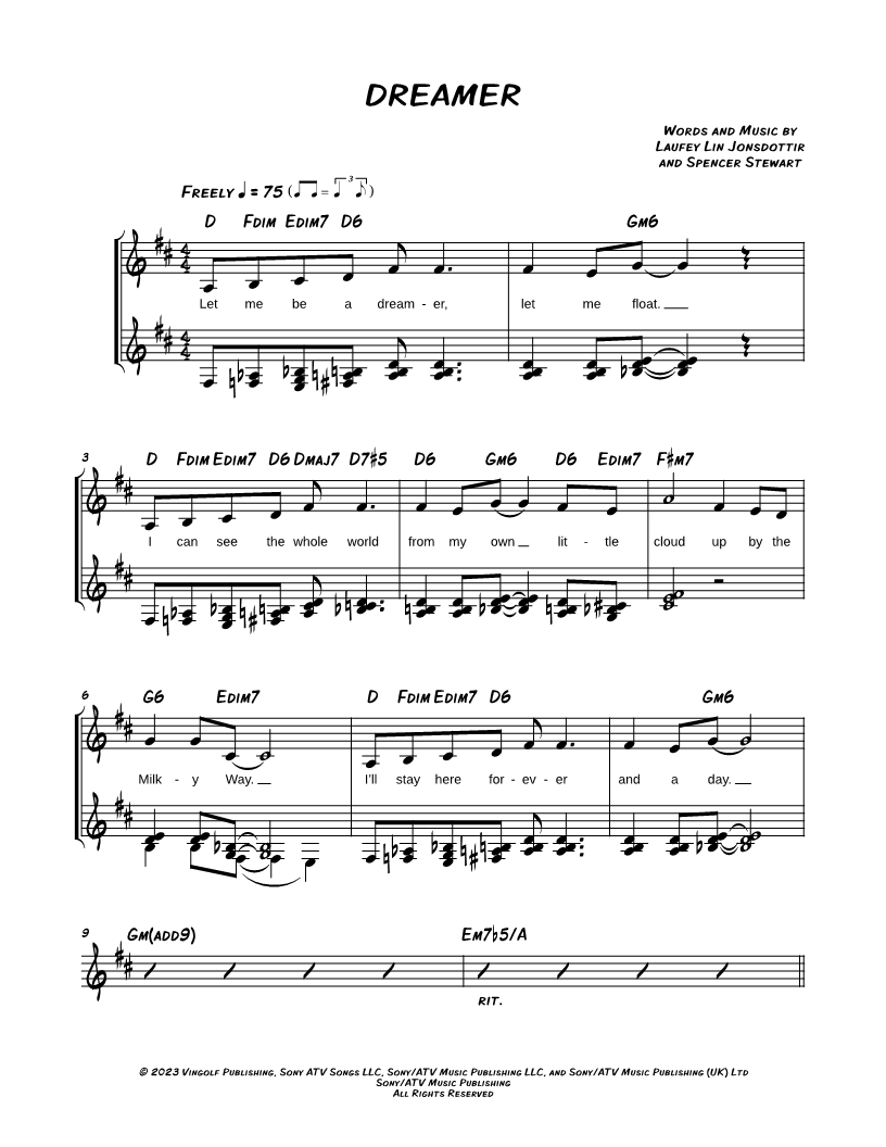 1. Dreamer - Laufey (click here to preview and play this piece) Performers: Composers: Lyricists: Scored For:Leadsheet and Lyrics/Melody/Chords Instruments:Voice, range: E3-A4 and C Instrument Number of pages:3 Click here to purchase this piece separately for $3.99 |