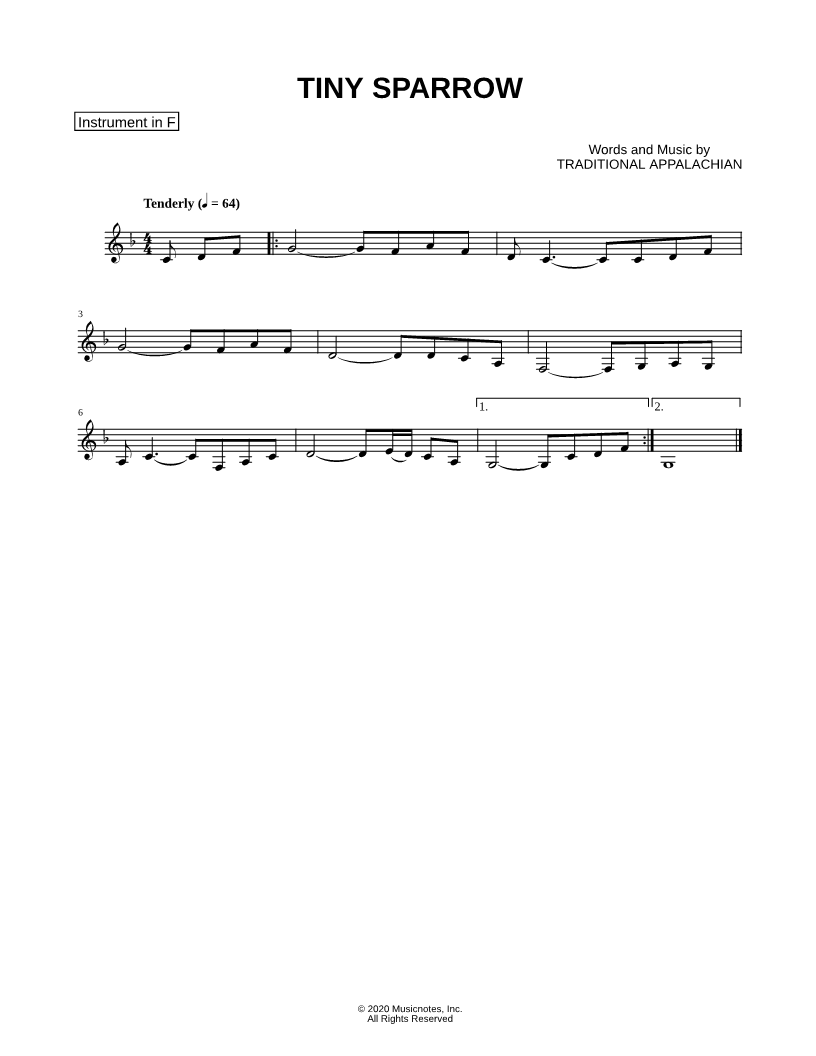 1. Tiny Sparrow - F Instrument (click here to preview and play this piece) Composer: Lyricist: Scored For:Instrumental Solo and Instrumental Part Instruments:F Instrument, range: F3-A4 and French Horn Number of pages:1 Click here to purchase this piece separately for $4.99 |