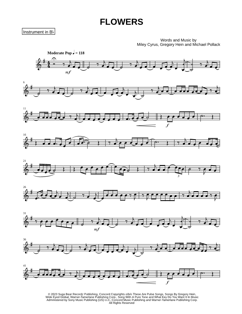 1. Flowers - Bb Instrument (click here to preview and play this piece) Performer: Composers: Lyricists: Scored For:Instrumental Solo and Instrumental Part Instruments:Bb Instrument, range: B3-E5, Trumpet, Clarinet, Soprano Saxophone and Tenor Saxophone Number of pages:2 Click here to purchase this piece separately for $4.99 |