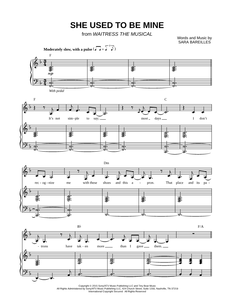 1. She Used to Be Mine (click here to preview and play this piece) Performer: Composer: Lyricist: Scored For:Piano/Vocal/Chords and Singer Pro Instruments:Voice, range: F3-D5 and Piano Number of pages:8 Click here to purchase this piece separately for $5.99 |