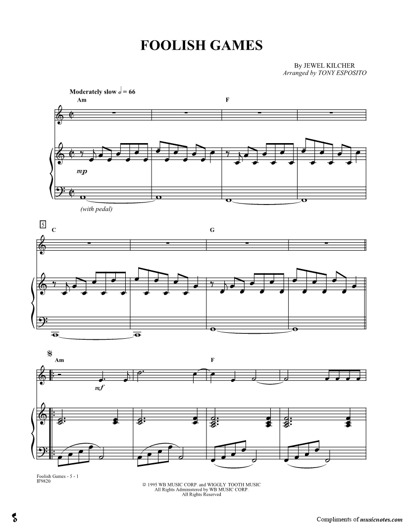 1. Foolish Games (click here to preview and play this piece) Performer: Composer: Lyricist: Scored For:Instrumental Solo Instrument:Piano Number of pages:5 Click here to purchase this piece separately for $4.99 |