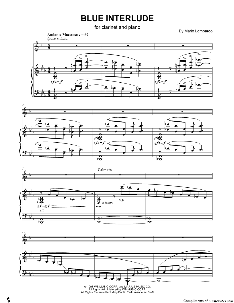 1. Blue Interlude - Piano Accompaniment (Clarinet) (click here to preview and play this piece) Composer: Scored For:Instrumental Part and Solo & Accompaniment Instruments:Clarinet, range: A3-D6 and Piano Accompaniment Number of pages:16 Click here to purchase this piece separately for $5.99 |
