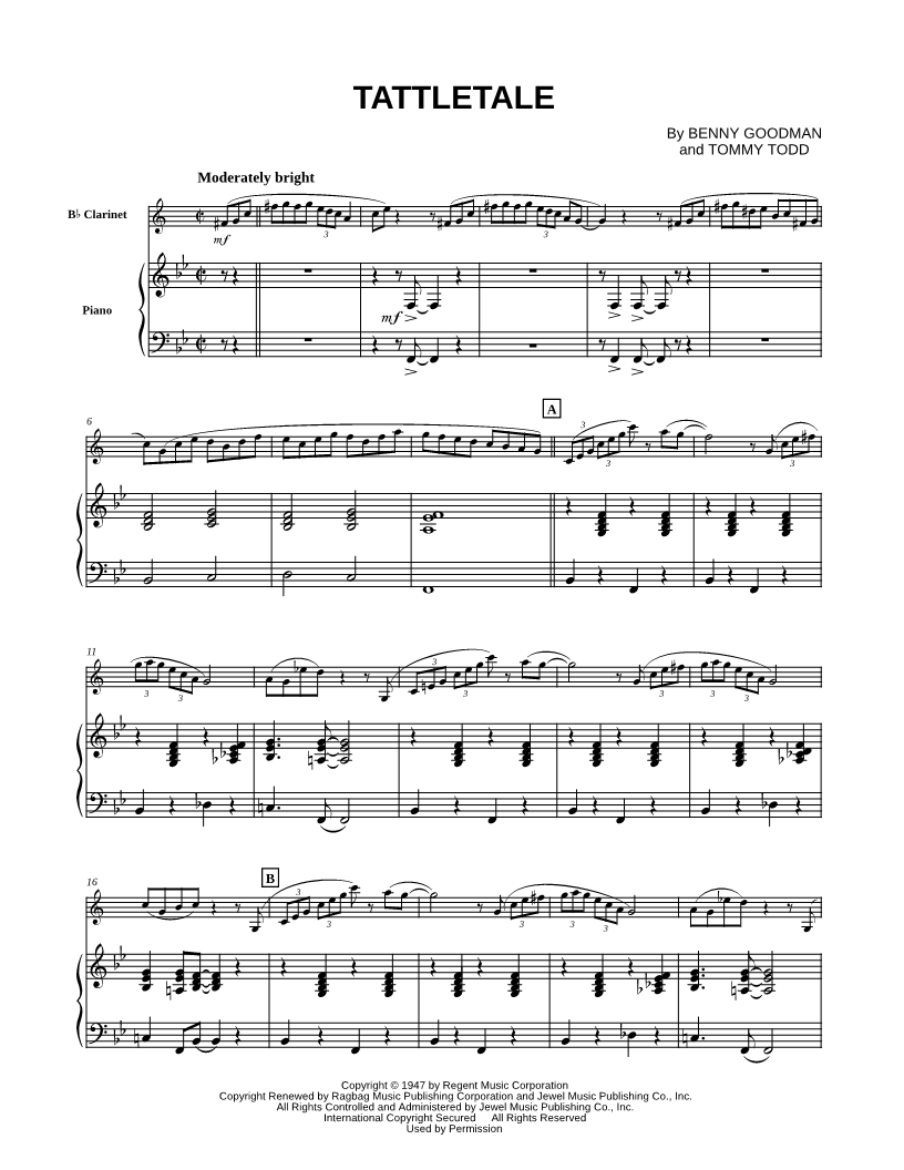 1. Tattletale - Piano Accompaniment (click here to preview and play this piece) Performer: Composers: Scored For:Solo & Accompaniment and Instrumental Part Instruments:Clarinet, range: G3-E6 and Piano Accompaniment Number of pages:4 Click here to purchase this piece separately for $5.99 |