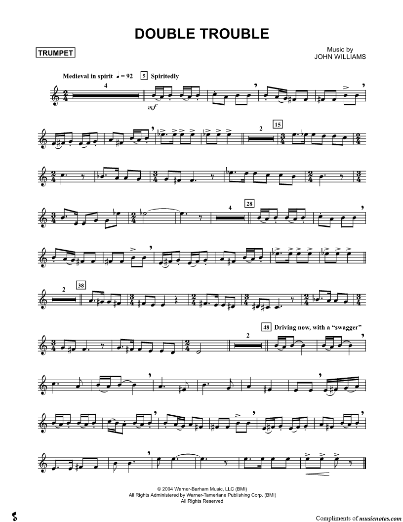 1. Double Trouble - Trumpet (click here to preview and play this piece) Composer: Scored For:Instrumental Part and Instrumental Solo Instrument:Trumpet, range: C#4-E5 Number of pages:1 Click here to purchase this piece separately for $4.99 |