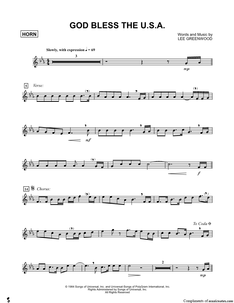 1. God Bless the U.S.A. - French Horn (click here to preview and play this piece) Performer: Composer: Lyricist: Scored For:Instrumental Solo and Instrumental Part Instrument:French Horn, range: Eb4-G5 Number of pages:2 Click here to purchase this piece separately for $4.99 |