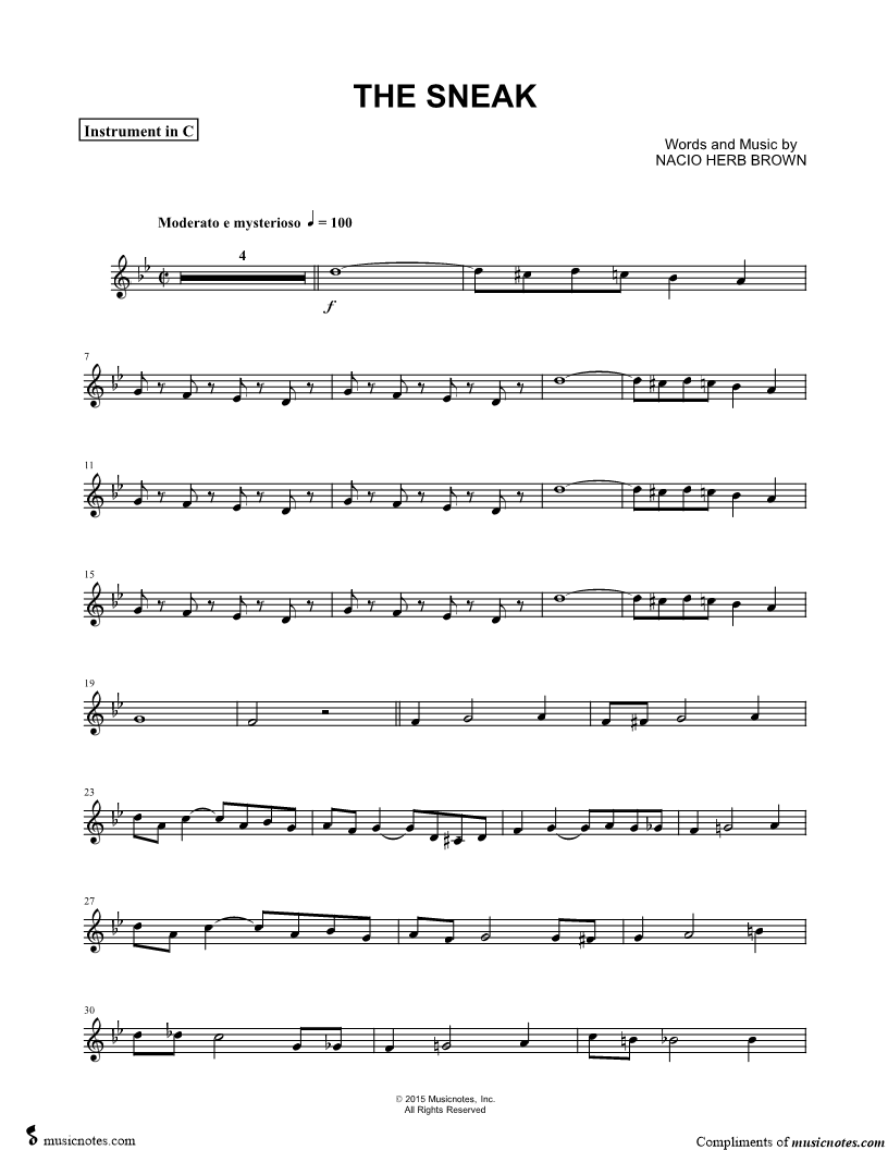 1. The Sneak - C Instrument (click here to preview and play this piece) Performers: Composer: Lyricist: Scored For:Instrumental Part and Instrumental Solo Instruments:C Instrument, range: C#4-G5, Violin, Oboe, Flute and Recorder Number of pages:2 Click here to purchase this piece separately for $4.99 |