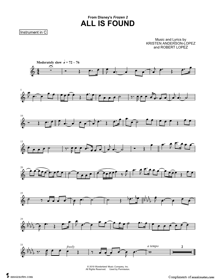 1. All Is Found - C Instrument (click here to preview and play this piece) Performer: Composers: Lyricists: Scored For:Instrumental Solo and Instrumental Part Instruments:C Instrument, range: G4-C6, Violin, Oboe, Flute and Recorder Number of pages:1 Click here to purchase this piece separately for $4.99 |