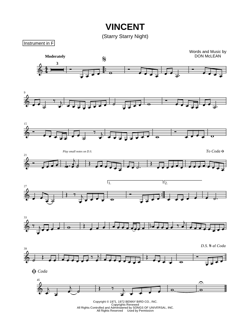 1. Vincent (Starry Starry Night) - F Instrument (click here to preview and play this piece) Performer: Composer: Lyricist: Scored For:Instrumental Solo and Instrumental Part Instruments:F Instrument, range: G3-A4 and French Horn Number of pages:1 Click here to purchase this piece separately for $4.99 |