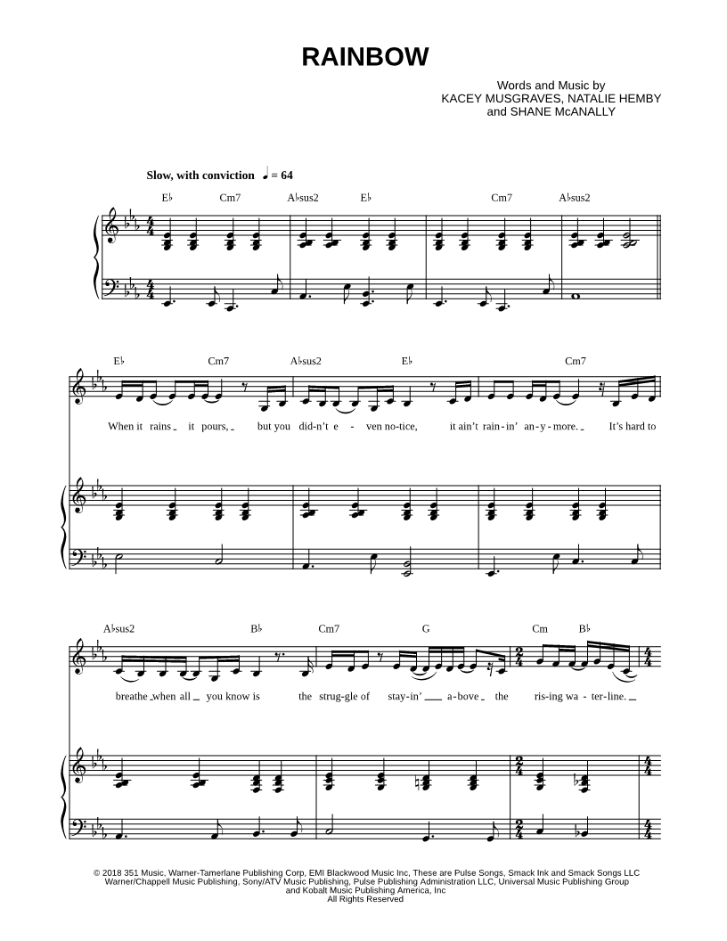 1. Rainbow (click here to preview and play this piece) Performer: Composers: Lyricists: Scored For:Piano/Vocal/Chords and Singer Pro Instruments:Voice, range: G3-Eb5 and Piano Number of pages:5 Click here to purchase this piece separately for $5.99 |