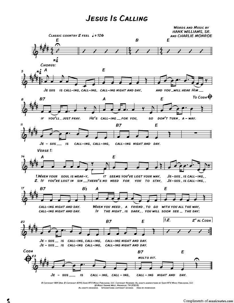 Jesus is calling, calling, calling night and day, and you will hear Him if you'll just pray. |