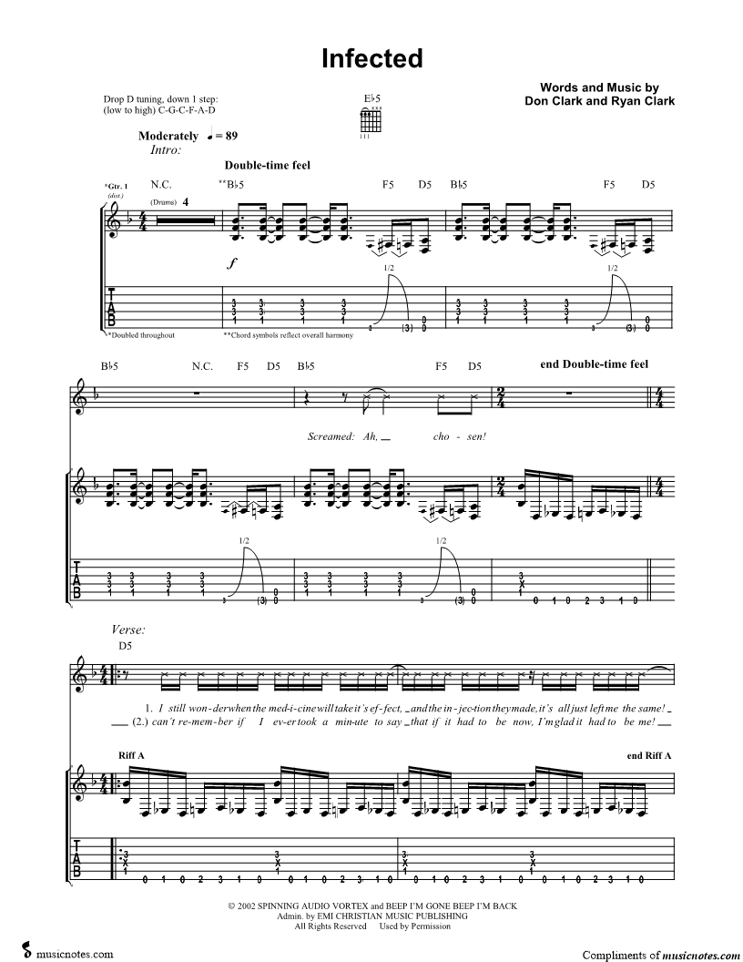 Voice, range: Bb3-Eb5 Guitar 1, range: D3-Bb4 Guitar 2 Guitar 3 Backup Vocals | |