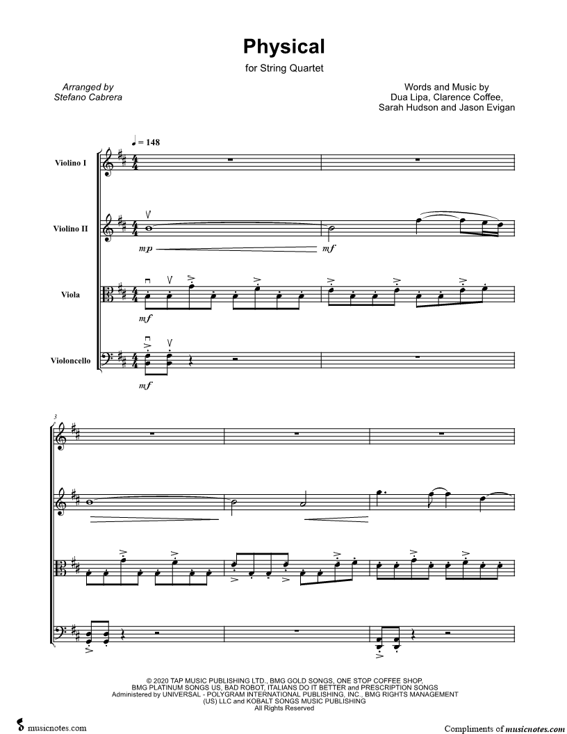 Violin 1, range: A3-G6 Violin 2, range: A3-A5 Viola, range: E3-C#5 Cello, range: D2-D4 | |