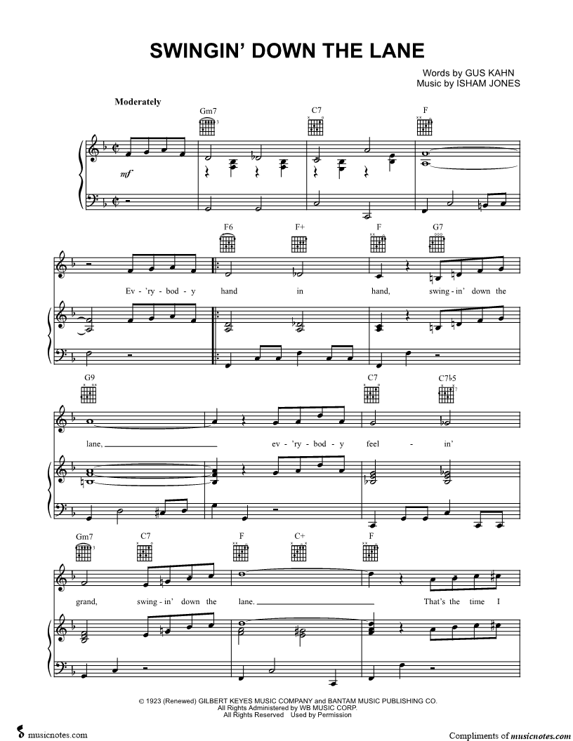 Ev'rybody hand in hand, swingin' down the lane, ev'rybody feelin' grand, swingin' down the lane. |