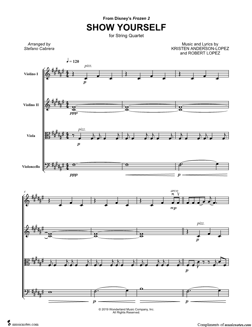 Violin 1, range: C4-Eb6 Violin 2, range: G3-A5 Viola, range: Db3-B4 Cello, range: C2-C4 | |