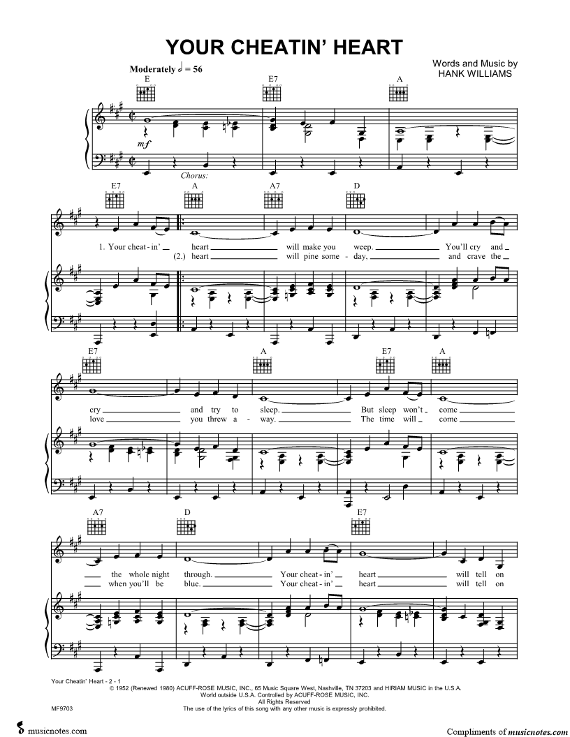 Your cheatin' heart will make you weep. You'll cry and cry and try to sleep. |