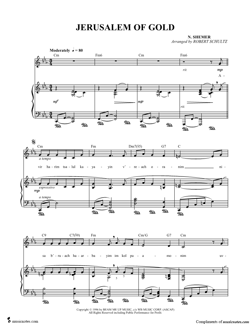 Avir harim tsalul kamayim v'reach oranim nisa b'ruach haarbayim im kol paamonim uvtardemat ilan vaeven sh'vuya bachaloma hairasher badad yoshevet ub'liba cho ma Y'rushalayim shel zahav v'shel n'choshet v'shel or halo l |