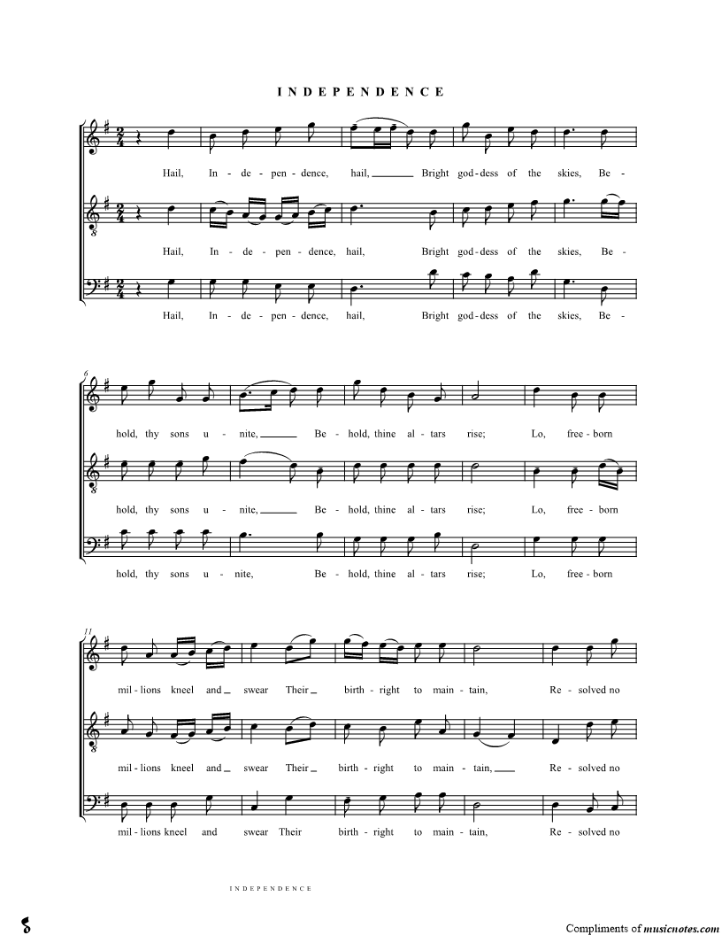 Hail, Independence, hail, Bright goddess of the skies, Behold, thy sons unite, Behold, thine altars rise; Lo, freeborn millions kneel and swear Their birthright to maintain, Resolved no foreign yoke to bear. |