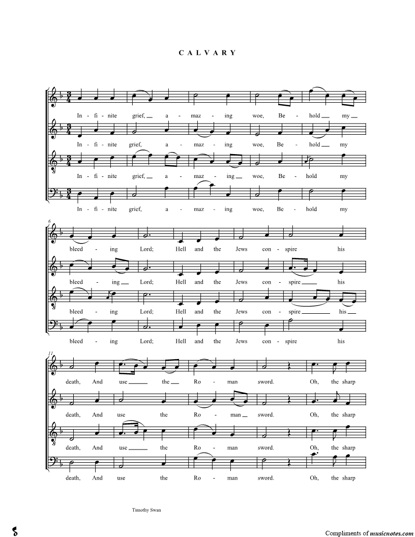 Infinite grief, amazing woe, Behold my bleeding Lord; Hell and the Jews conspire his death, And use the Roman sword. |