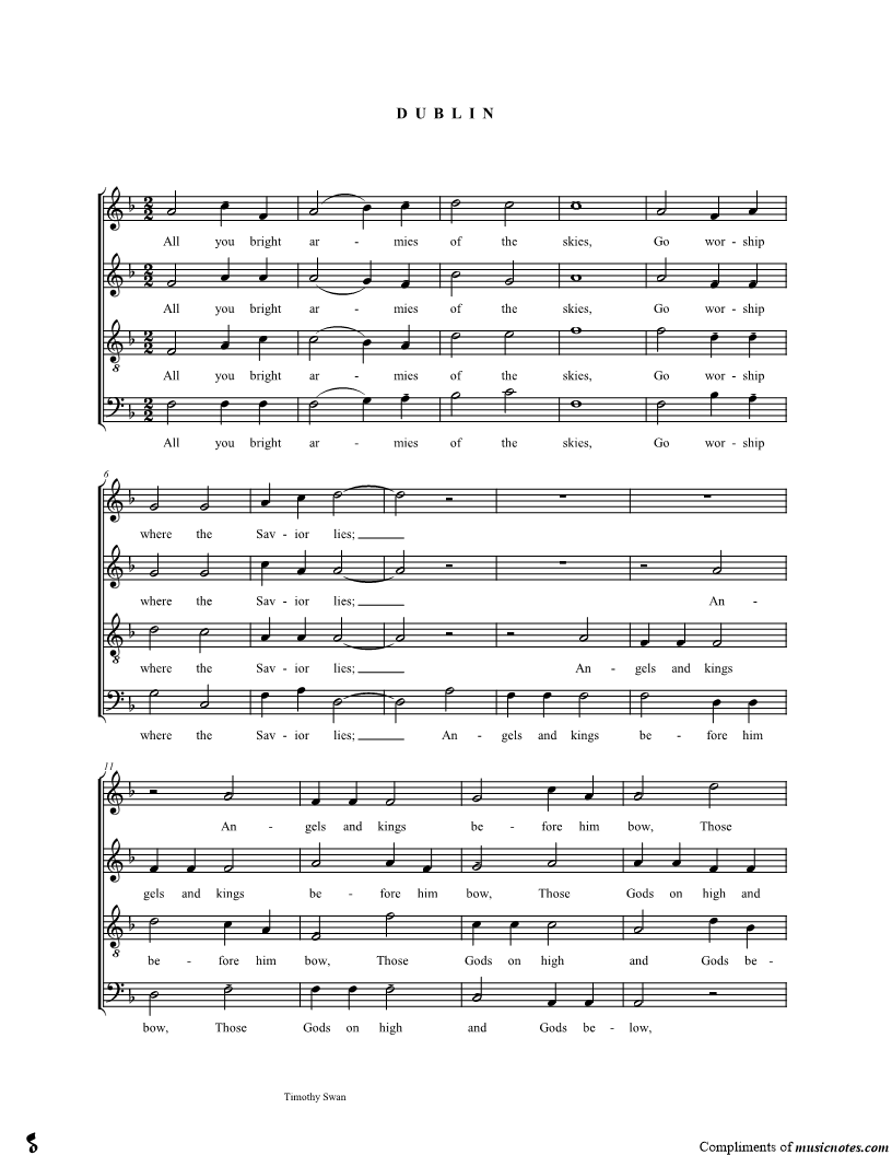 All you bright armies of the skies, Go worship where the Savior lies; Angels and kings before him bow, Those Gods on high and Gods below. |