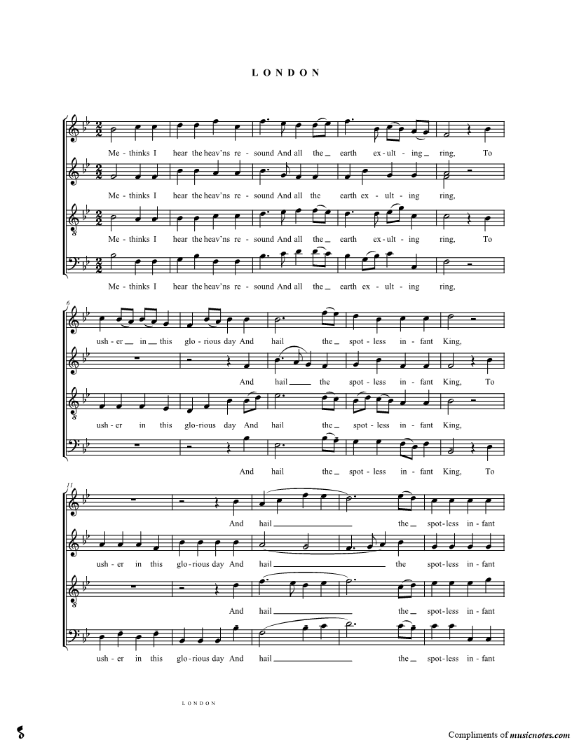 Methinks I hear the heav'ns resound And all the earth exulting ring, To usher in this glorious day And hail the spotless infant King. |