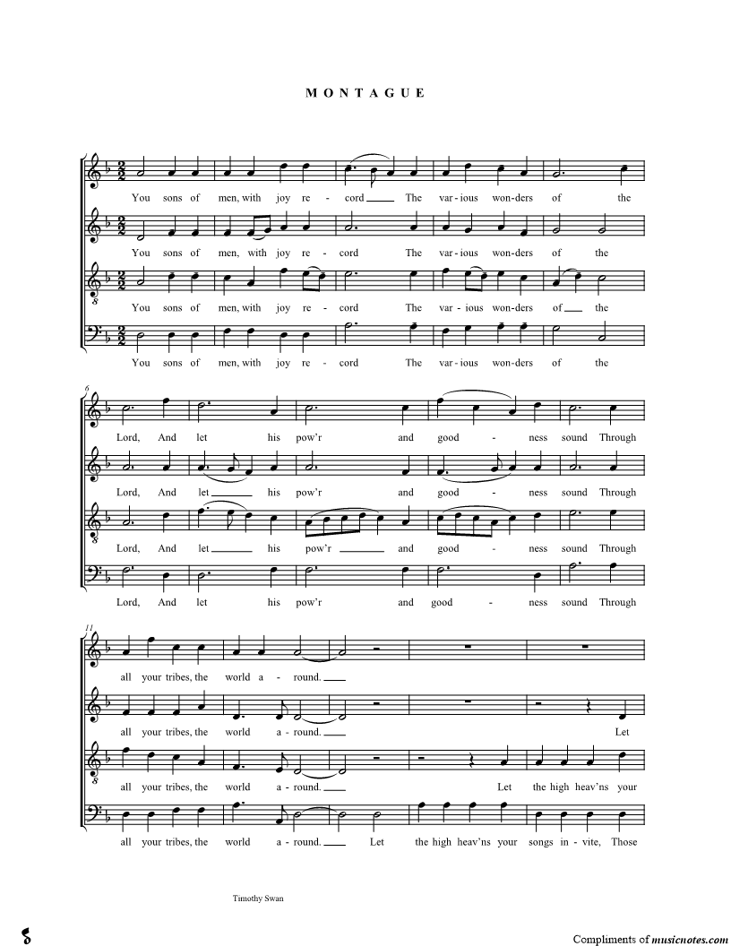 You sons of men, with joy record The various wonders of the Lord, And let his pow'r and goodness sound Through all your tribes, the world around. |