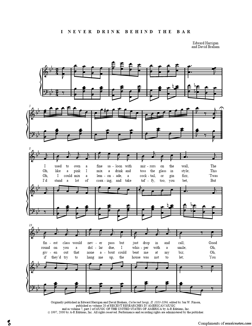I used to own a fine saloon with mirrors on the wall, The finest class would never pass but just drop in and call; Good morning, Pete, they'd say to me, you're looking slick tata, Oh, will you jine? |