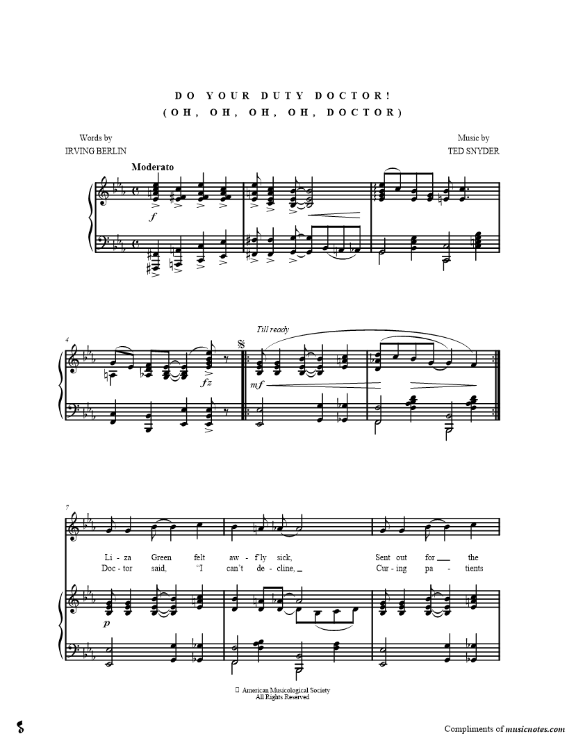 Liza Green felt awf'ly sick, Sent out for the doctor quick, The doctor called around, these words to say "You're suff'ring from a love attack, And if you want to bring health back, A loving man must love you every day. |
