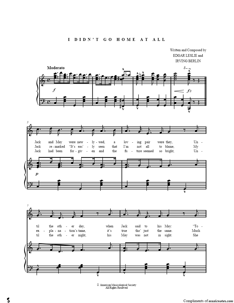 Jack and May were newlywed, a loving pair were they, Until the other day, when Jack said to his May "Tonight I have to talk some bus'ness with some bus'ness men, But rest assured that I'll return at ten." |
