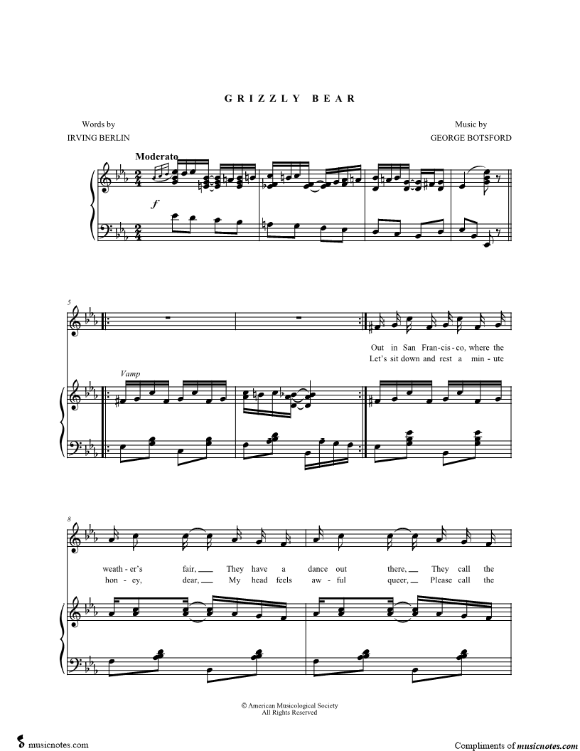 Out in San Francisco, where the weather's fair, They have a dance out there, They call the "Grizzly Bear." |