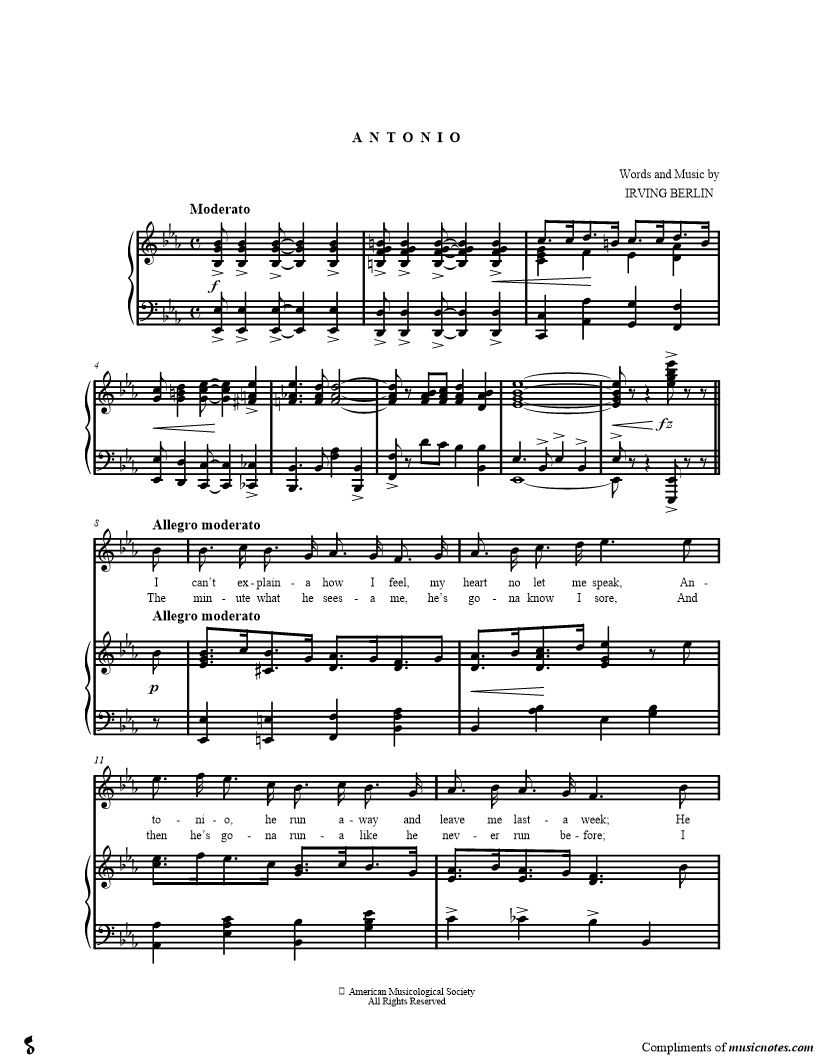 I can't explaina how I feel, my heart no let me speak, Antonio, he run away and leave me lasta week; He take 'em all the money what I hide under the floor, He also take the Irish gal that livea next adoor; |